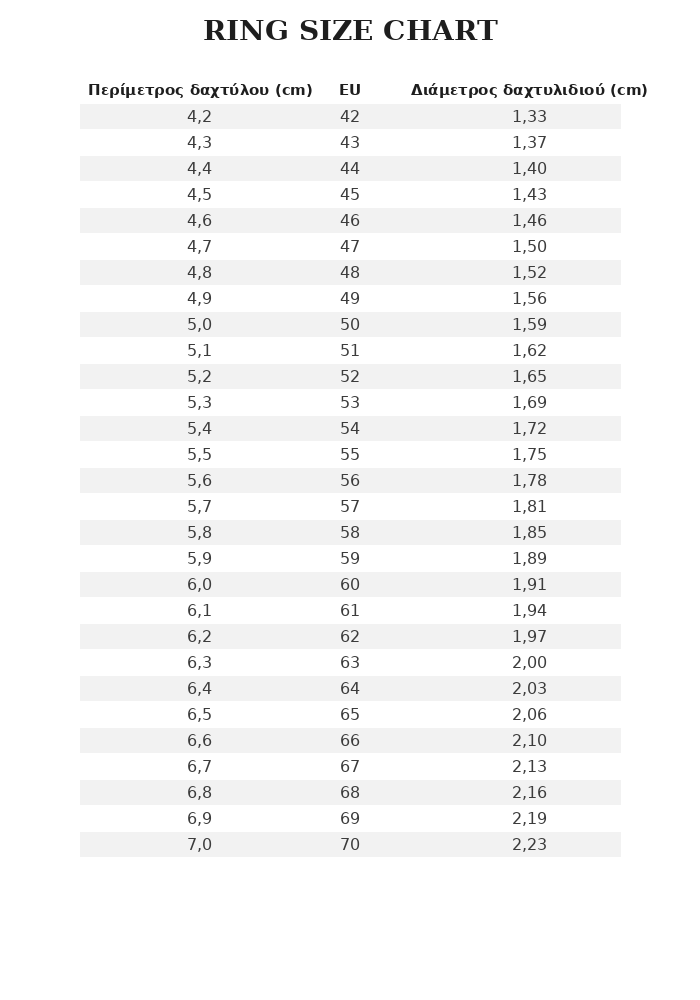 Συγκρίνετε τα χιλιοστά που μετρήσατε με τον πίνακα μεγεθών που ακολουθεί στο e-shop μας. Στα ευρωπαϊκά νούμερα, ο αριθμός των χιλιοστών της περιμέτρου αντιστοιχεί στο νούμερο του δαχτυλιδιού.