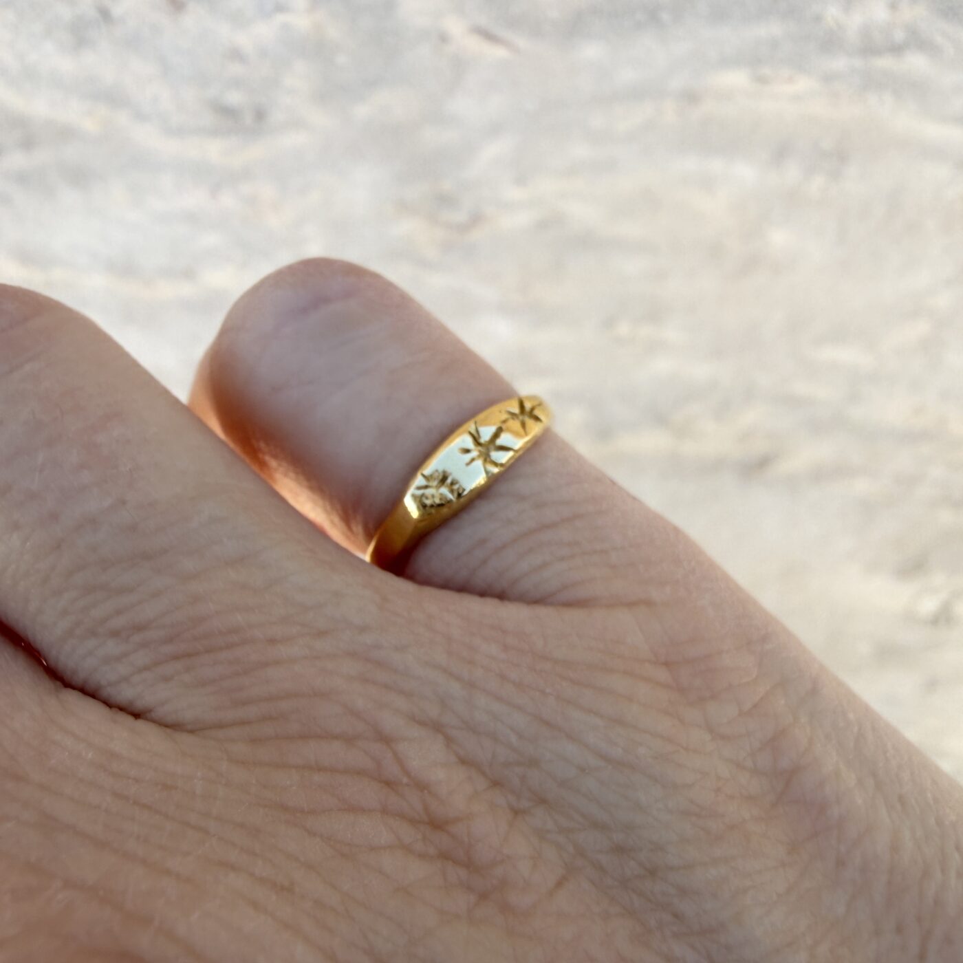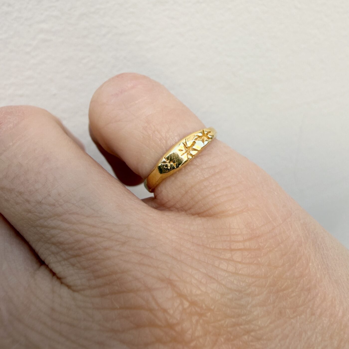 Ένα κομψό και παιχνιδιάρικο pinky ring με τρία χειροποίητα αστέρια, κατασκευασμένο από ασήμι 925 με επιχρύσωση 18Κ. Τα τρία hand-curved αστέρια στο επάνω μέρος δημιουργούν ένα μοναδικό, καλλιτεχνικό αποτέλεσμα που ξεχωρίζει, ενώ το γυαλιστερό φινίρισμα προσθέτει διακριτική χρυσή λάμψη.